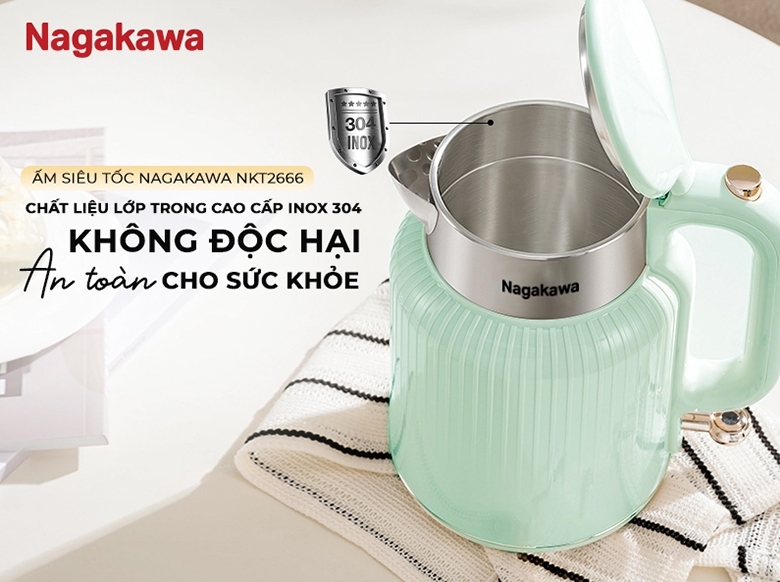 Ấm siêu tốc Nagakawa 1.7 lít NKT2666 có kiểu dáng hiện đại, nhỏ gọn cùng thiết kế sang trọng. Thân ấm 2 lớp gồm lớp nhựa cao cấp cách nhiệt bên ngoài và lớp inox 304 bên trong, không chỉ đảm bảo độ bền mà còn an toàn cho sức khỏe. Sản phẩm được trang bị rơ le kép tự ngắt khi nước sôi và khi ấm cạn nước, đảm bảo an toàn tuyệt đối cho người dùng khi sử dụng.