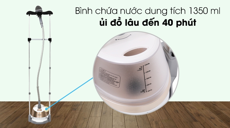Bàn là có bình chứa nước dung tích 1350 ml, cho thời gian ủi đồ liên tục đến 40 phút