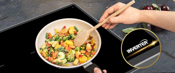 Công nghệ Inverter trên bếp có khả năng tự nhận diện chất liệu đáy nồi để đưa ra mức tần số dòng điện phù hợp, nhằm duy trì mức công suất tối ưu ổn định. Nhờ vậy mà khi đun nấu sẽ giúp tiết kiệm điện hiệu quả mà còn đảm bảo độ bền cho bếp.