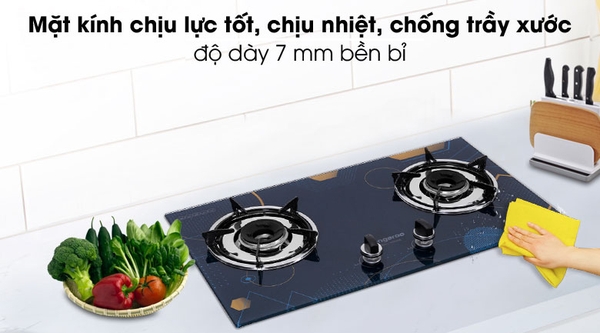 Mặt bếp gas âm bằng kính cường lực dày 7 mm, chịu lực tốt, chịu nhiệt, chống trầy xước, cho độ bền cao và dễ dàng lau chùi