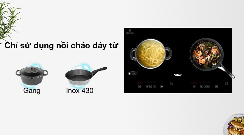- Bếp sử dụng nồi/chảo có đáy từ (inox 430/gang) dạng đáy liền. Không sử dụng nồi, chảo có đáy rỗ tổ ong để tránh thất thoát nhiệt và hư hỏng sản phẩm.