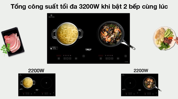 Tính năng chia sẻ công suất với tổng công suất tối đa 3200W khi bật 2 bếp đồng thời, nấu ăn nhanh