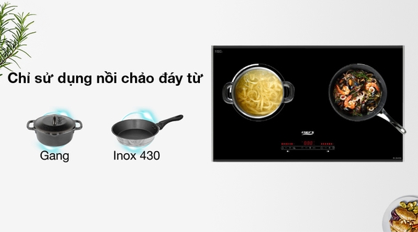 - Bếp sử dụng nồi/chảo có đáy từ (inox 430/gang) dạng đáy liền. Không sử dụng nồi, chảo có đáy rỗ tổ ong để tránh thất thoát nhiệt và hư hỏng sản phẩm.