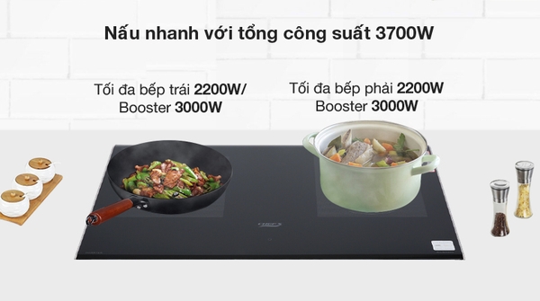 Nấu ăn nhanh chóng với tổng công suất tối đa 3700W khi bật 2 bếp