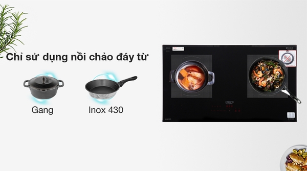 Bếp từ kén nồi, cần dùng với nồi nấu có chất liệu đáy nồi phù hợp như gang, inox 430 để có hiệu quả gia nhiệt tốt nhất![]()