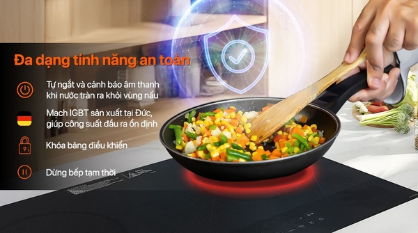 - Tự ngắt và cảnh báo âm thanh khi nước tràn ra khỏi vùng nấu: bếp phát tín hiệu cảnh báo và ngắt điện kịp thời, bảo vệ linh kiện và duy trì an toàn.