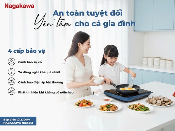 An toàn luôn là yếu tố được quan tâm hàng đầu trong mọi hoạt động của cuộc sống, nhất là với những thiết bị điện sinh nhiều nhiệt và tiêu hao nhiều điện năng như bếp từ. Vì thế, Nagakawa NIC6212 đã được trang bị 4 cấp bảo vệ thông minh: cảnh báo mã lỗi, tự động ngắt khi quá nhiệt, cảnh báo khi điện áp bất thường (quá cao/thấp), và cảnh báo khi không có nồi/chảo. Kết hợp cùng chức năng khóa an toàn trẻ em, mang đến sự tiện lợi và an tâm tuyệt đối cho các gia đình bận rộn có trẻ nhỏ hiếu động.![]()