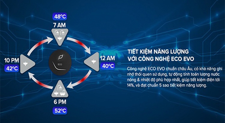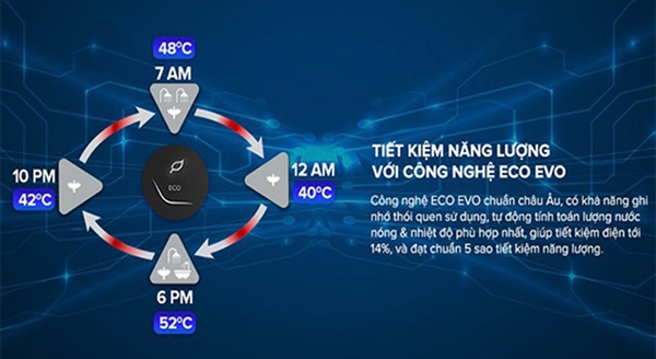 Được ứng dụng công nghệ Eco Evo tiên tiến nhất của hãng theo tiêu chuẩn châu Âu giúp tiết kiệm đến 14% điện năng tiêu thụ. Nhờ vậy, bình nước nóng sẽ có khả năng ghi nhớ thói quen sử dụng của người dùng, sau đó tính toán và đề xuất mức nhiệt độ nước nóng phù hợp nhất với mức điện năng thấp nhất.![]()