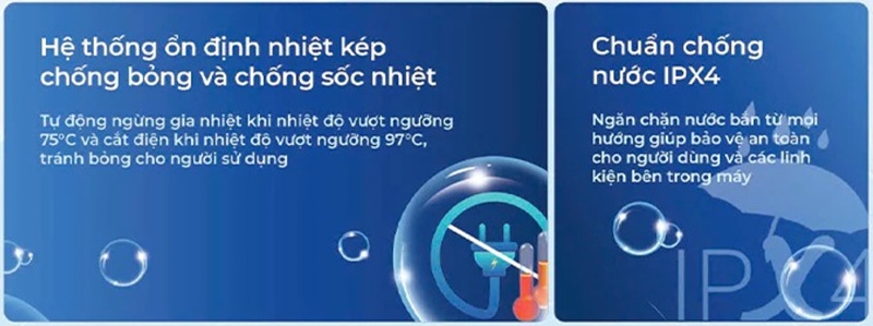 Để bạn hoàn toàn yên tâm khi sử dụng, Aqua AES30H-SUPER được trang bị hệ thống cảm biến nhiệt kép TTS. Hệ thống này sẽ tự động ngắt nguồn điện khi nhiệt độ nước vượt quá ngưỡng an toàn (65°C hoặc 85°C). Từ đó ngăn chặn nguy cơ bỏng và bảo vệ máy khỏi những hư hỏng do quá tải nhiệt.![]()