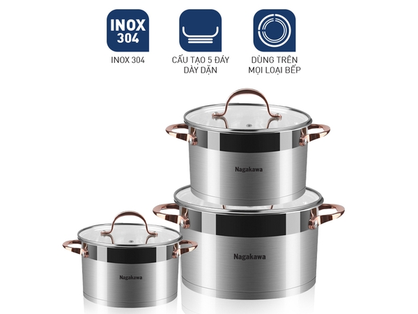 Bộ 3 nồi inox cao cấp 5 đáy Nagakawa NAG1352 (16cm, 20cm, 24cm) dùng cho mọi loại bếp