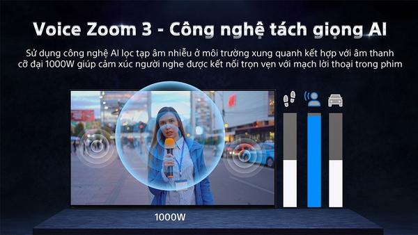 Công nghệ Voice Zoom 3 sử dụng trí tuệ nhân tạo để nhận diện và tách biệt giọng thoại khỏi tiếng ồn nền, nhờ đó giúp cho lời thoại trong phim, chương trình truyền hình hoặc của bình luận viên thể thao luôn rõ ràng. Đây là tính năng lý tưởng khi bạn xem phim có nhiều hiệu ứng âm thanh phức tạp, giúp bạn không bỏ lỡ bất kỳ câu thoại quan trọng nào.![]()