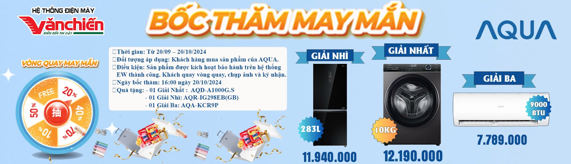 Tham gia ngay chương trình bốc thăm trúng thưởng Aqua tại Điện Máy Văn Chiến. Cơ hội nhận quà giá trị và ưu đãi hấp dẫn. Đăng ký ngay để không bỏ lỡ!