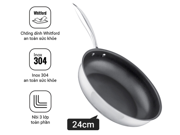 Lòng chảo có tráng lớp chống dính công nghệ Whitford (Mỹ) không chứa PFOA siêu bền và an toàn cao. Nhờ lớp chống dính này mà chảo luôn giữ được vẻ sáng bóng, hạn chế trầy xước, dễ vệ sinh sau mỗi lần dùng. Đặc biệt bạn có thể giảm lượng dầu mỡ khi nấu một cách đáng kể