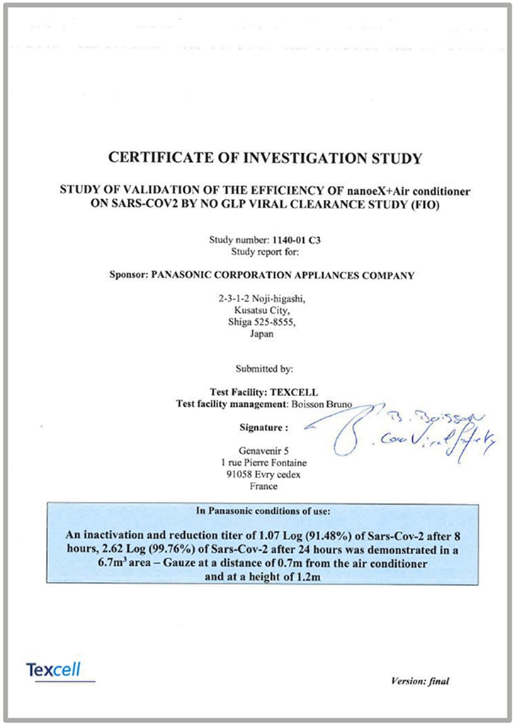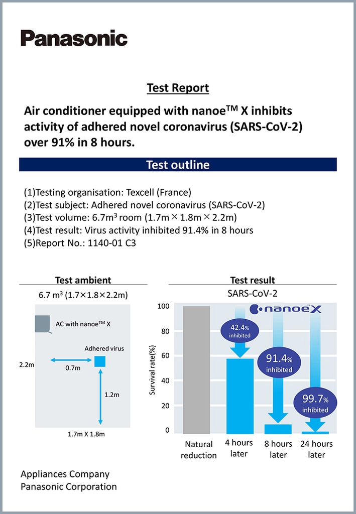 Kết quả kiểm nghiệm công nghệ Nanoe™️ X có khả năng ức chế vi-rút Corona trong điều kiện phòng thí nghiệm.