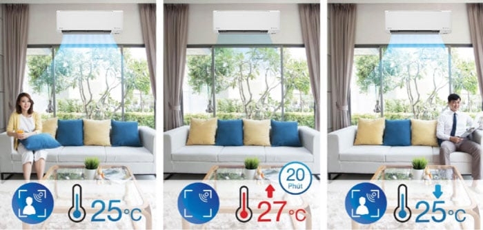 Cụ thể nếu không có chuyển động nào trong vòng 20 phút, máy sẽ tự động điều chỉnh nhiệt độ cài đặt khoảng 2 độ C.![]()