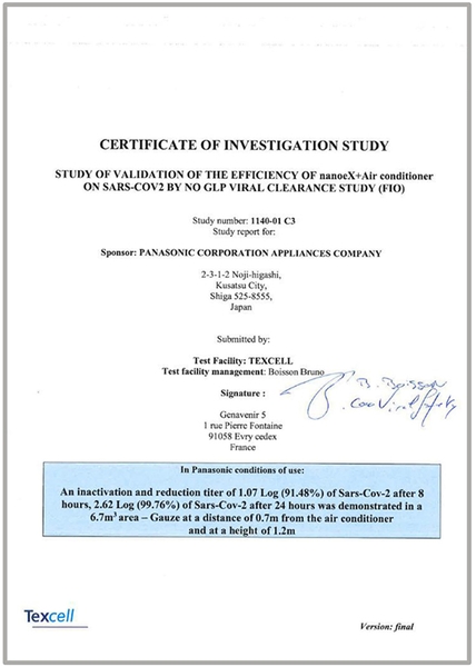 Panasonic cùng tổ chức nghiên cứu Texcell, là một tổ chức nghiên cứu toàn cầu chuyên về thử nghiệm vi-rút đã thử nghiệm và cho ra kết quả rằng công nghệ Nanoe™️ X có thể ức chế 91.4% khả năng hoạt động của vi-rút Corona gây ra đại dịch COVID-19 trong không gian kín 6,7 m3 khi bật điều hòa trong vòng 8 giờ.