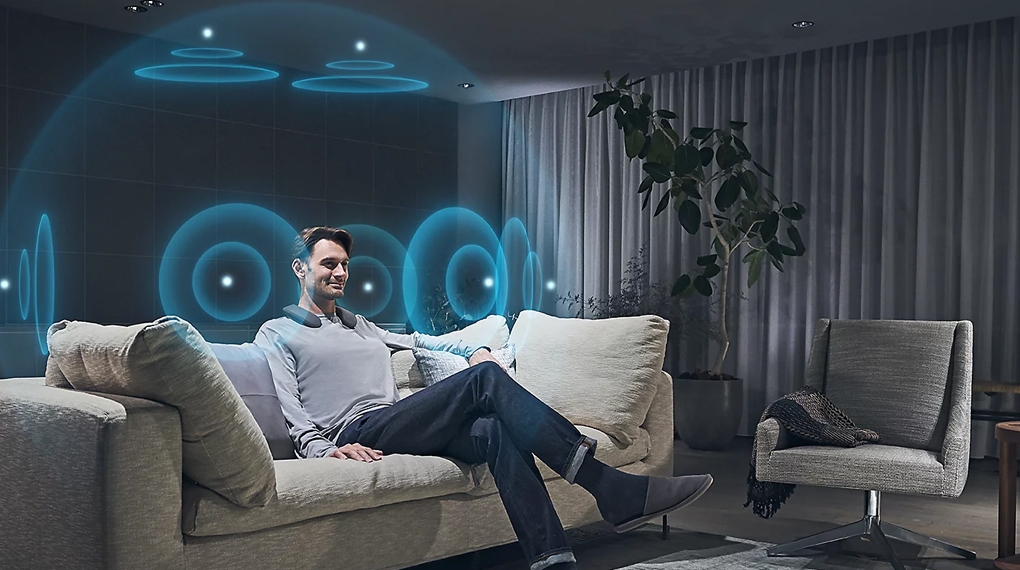 - Ngoài ra, khi bạn liên kết tivi với loa thanh Sony A-Series, công nghệ Acoustic Center Sync sẽ giúp XR-65X95L trở thành loa trung tâm để bản nhạc bạn đang xem phát ra hoàn toàn khớp với biểu cảm của ca sĩ trên màn hình. Nếu dùng tivi với loa choàng cổ SRS-NS7 và thiết bị chuyển tiếp không dây WLA-NS7 nhờ công nghệ 360 Spatial Sound Personalizer, bạn sẽ được trải nghiệm không gian âm thanh vòm giả lập vô cùng lôi cuốn, sinh động. ![]()
