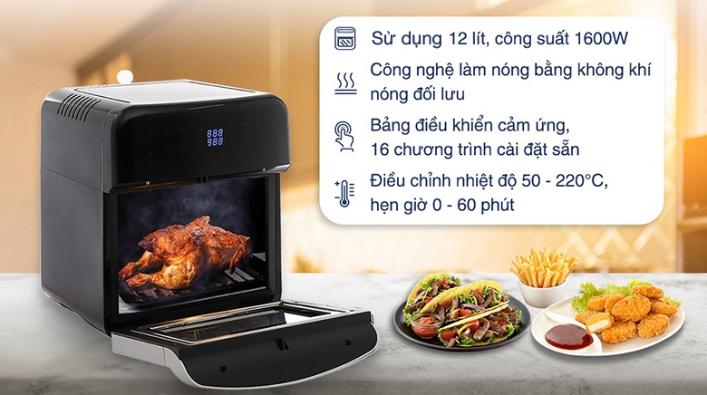 - Công nghệ làm nóng bằng không khí nóng đối lưu, giúp thức ăn chín đều các mặt, nóng hổi thơm ngon.