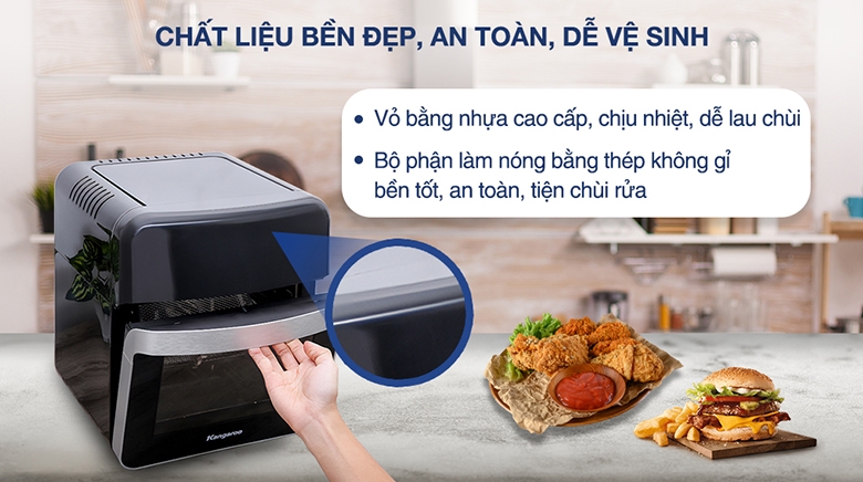 - Mẫu nồi chiên không dầu Kangaroo này còn có chế độ giữ ấm, rã đông và sấy khô cực kỳ tiện lợi.