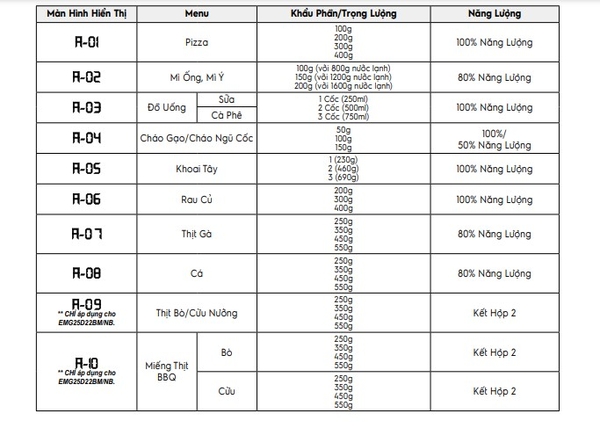 - Lò giúp chế biến đa dạng món ăn với thực đơn nấu tự động gồm 10 món: pizza, mì ống/mì ý, đồ uống (sữa, cà phê), cháo gạo/cháo ngũ cốc, khoai tây, rau củ, thịt gà, cá, thịt bò/cừu nướng, miếng thịt BBQ (bò, cừu).