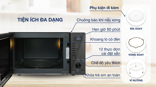 - Lò vi sóng này đảm bảo an toàn cho người dùng, đặc biệt là những gia đình có trẻ nhỏ nhờ tính năng khóa bảng điều khiển.