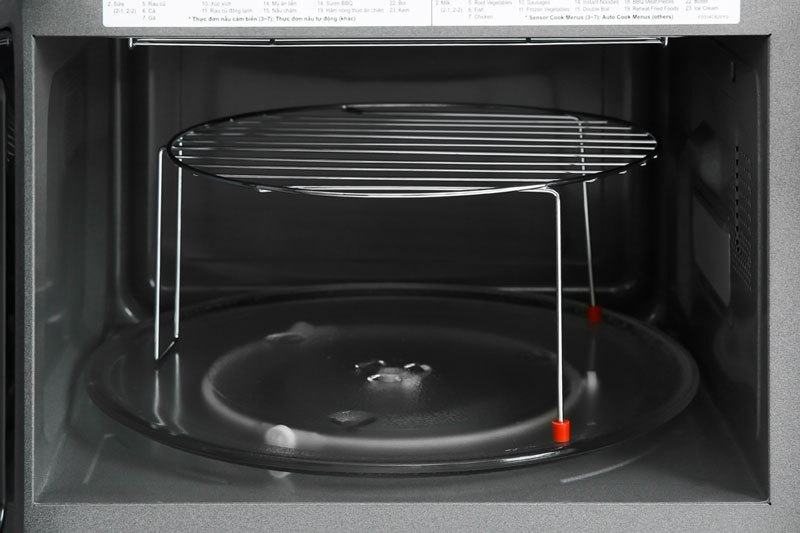 Đi kèm lò có vòng xoay, đĩa thủy tinh, giá nướng hỗ trợ xoay món ăn đều trong lò, cho thức ăn nóng ngon đúng chuẩn![]()