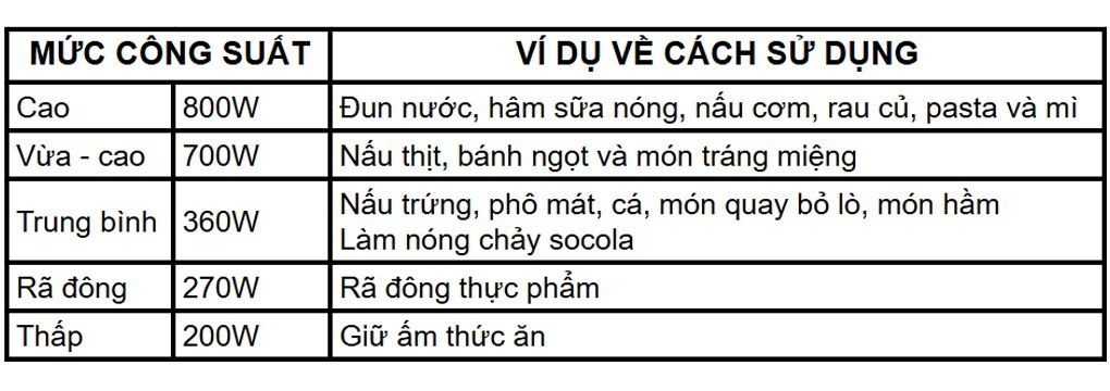 - Chế độ vi sóng với 5 mức từ thấp đến cao, lần lượt gồm: thấp, rã đông, trung bình, vừa - cao, cao.
