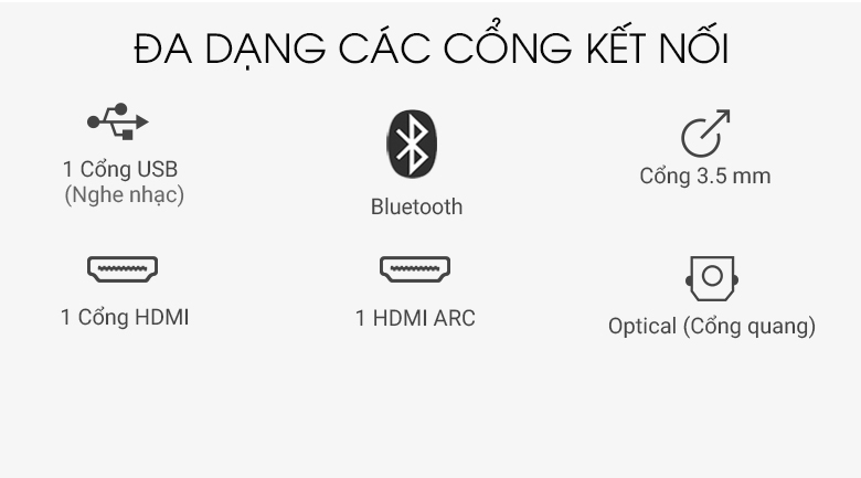 Cùng với kết nối không dây thông minh, loa thanh còn có thể nghe nhạc trực tiếp từ USB tiện lợi, kết nối với các thiết bị giải trí khác qua cổng HDMI nhanh chóng hay chia sẻ nội dung với tivi qua cổng Optical có sẵn.![]()