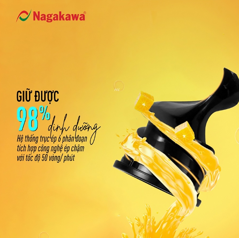 Máy ép Nagakawa sở hữu công nghệ ép chậm tiên tiến với tốc độ 50 vòng/phút, hạn chế sinh nhiệt, đảm bảo giữ được 98% chất dinh dưỡng và 100% hương vị tự nhiên của rau củ. Trục ép của máy bằng nhựa PMMA với độ cứng gấp 10 lần thủy tinh thông thường, ép kiệt bã và nước.![]()