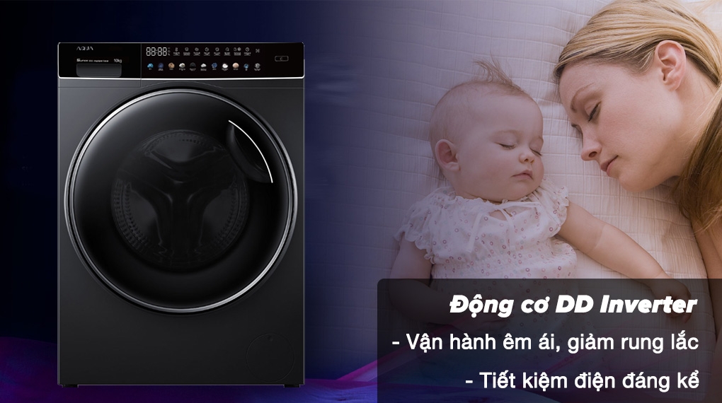 - Động cơ DD Inverter: Giúp cho máy giặt Aqua đạt hiệu quả giặt sạch tối ưu mà vẫn đảm bảo tiêu chí vận hành êm ái, giảm thiểu tình trạng rung lắc trong suốt chu trình giặt và tiết kiệm điện năng đáng kể.