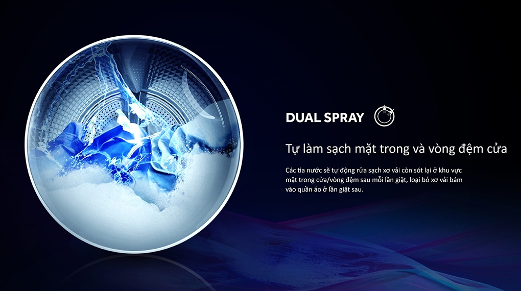 - Smart Dual Spray giúp loại bỏ xơ vải, mảng bám ở mặt trong cửa và vòng đệm sau mỗi lần giặt.![]()