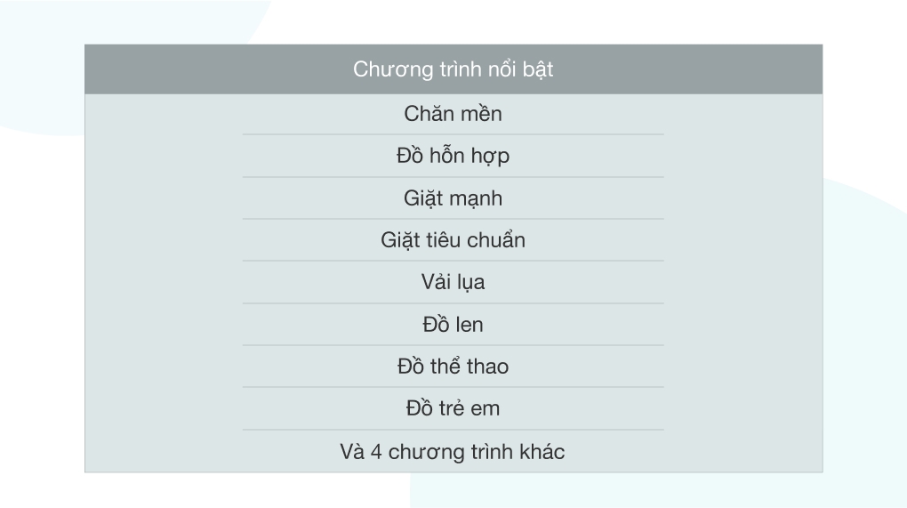 - 12 chương trình hoạt động được tích hợp sẵn phù hợp với nhiều nhu cầu giặt giũ khác nhau: Giặt tiêu chuẩn, giặt nhanh, giặt chăn mền, chống nhăn, đồ thể thao,... (xem thêm tại bảng thông số kỹ thuật). Chương trình giặt "nhanh" thích hợp cho các loại quần áo mỏng, ít bẩn cần làm sạch nhanh để sử dụng.![]()