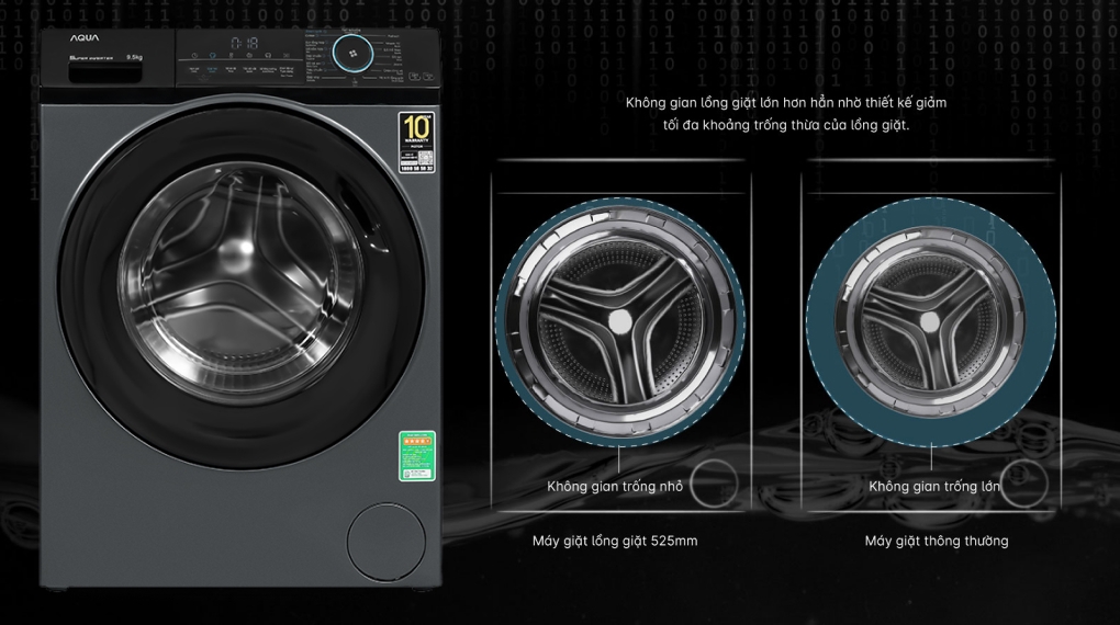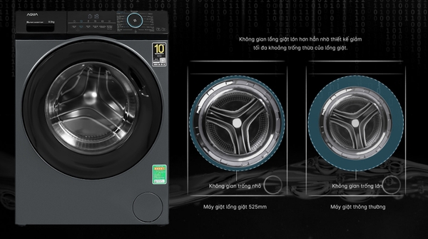 Máy giặt Aqua Inverter 9.5 kg AQD-A952J BK có khối lượng giặt 9.5 kg có thể giặt khoảng 15 - 16 bộ quần áo/lần giặt, lồng giặt TO 525 mm nâng cao hiệu quả giặt giũ. Ngoài ra được trang bị công nghệ BLDC Inverter tiết kiệm điện năng, giúp máy vận hành êm ái.