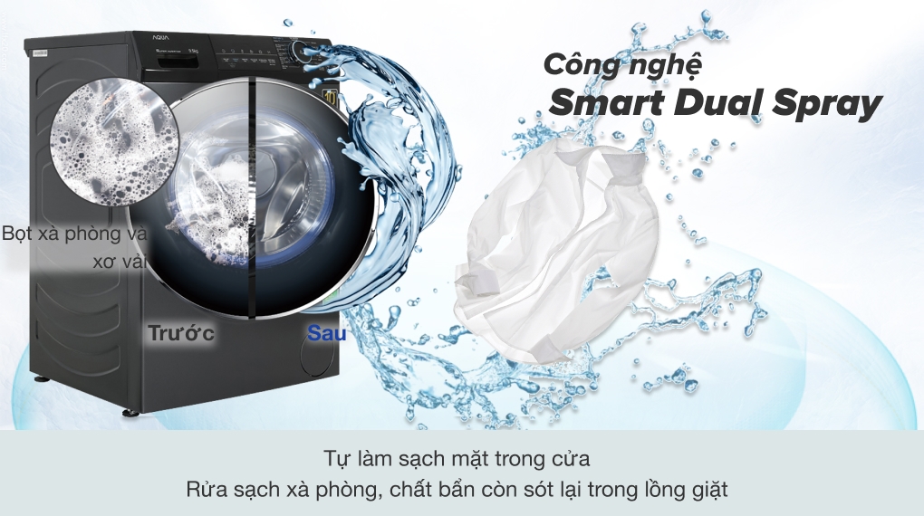 - Công nghệ Smart Dual Spray tự làm sạch mặt trong cửa và vòng đệm cửa, các tia nước sẽ tự động rửa sạch xơ vải còn sót lại trong lồng giặt, ngoài ra công nghệ này còn làm sạch xà phòng, chất bẩn bám trên thành cửa máy, giúp quần áo lấy ra được sạch sẽ hơn.![]()