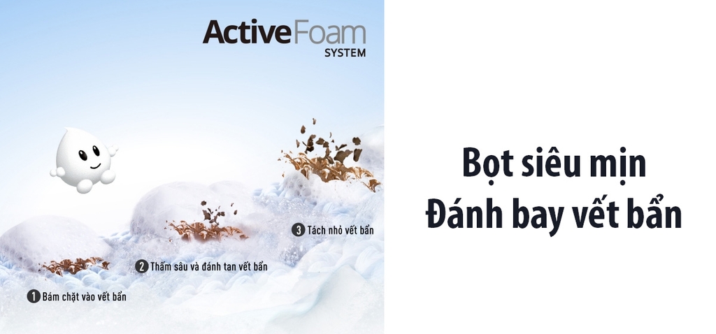 Hệ thống ActiveFoam tạo ra bọt siêu mịn, đậm đặc và len lỏi sâu vào sợi vải, giúp loại bỏ hoàn toàn bụi bẩn và các vết bẩn khó khăn trên quần áo. Với ActiveFoam, quá trình giặt trở nên hiệu quả hơn bao giờ hết. Bọt bám chặt vào vết bẩn, kết hợp với chuyển động lồng giặt, giúp tác động mạnh mẽ và loại bỏ hoàn toàn bụi bẩn.![]()