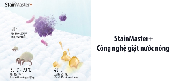 Công nghệ giặt nước nóng StainMaster+ cho phép giặt với nước nóng ở nhiệt độ lý tưởng từ 40 đến 90°C, giúp loại bỏ hiệu quả các loại vết bẩn, mạt bụi và 99,99% vi khuẩn trên các loại vải.