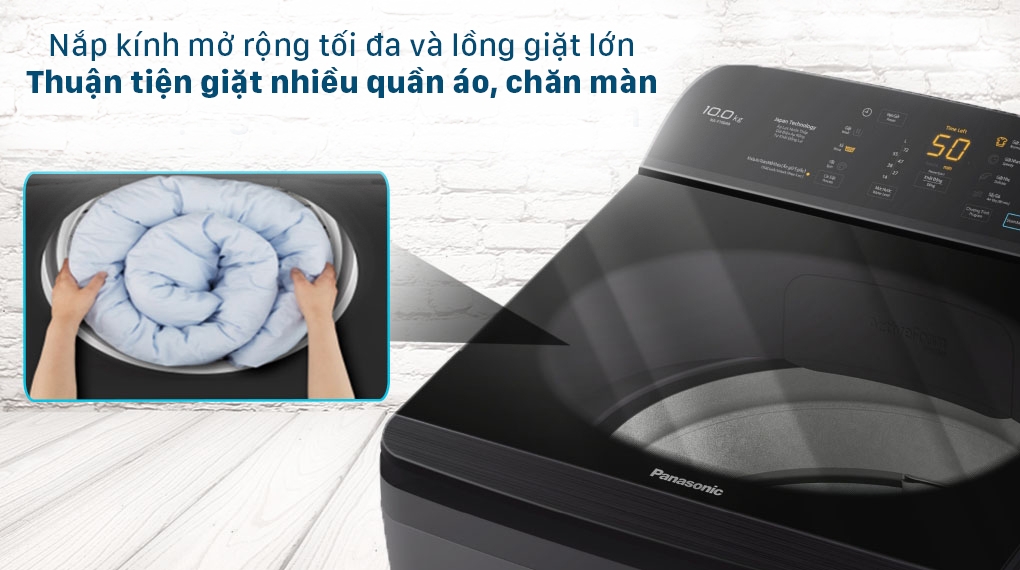 Tiết kế mới với nắp máy có thể mở rộng tối đa kết hợp với kích thước lồng giặt lớn thuận tiện cho vào hoặc lấy quần áo ra khỏi máy, ngay cả với những đồ có kích thước lớn như chăn, gối,... Từ đó, quá trình giặt giũ trở nên tiện lợi và dễ dàng hơn rất nhiều.