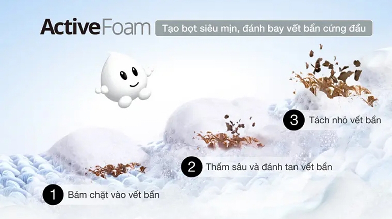 Hệ thống ActiveFoam tạo ra các siêu bọt khí đậm đặc len lỏi vào từng sợi vải loại bỏ các vết bẩn bám trên quần áo.![]()