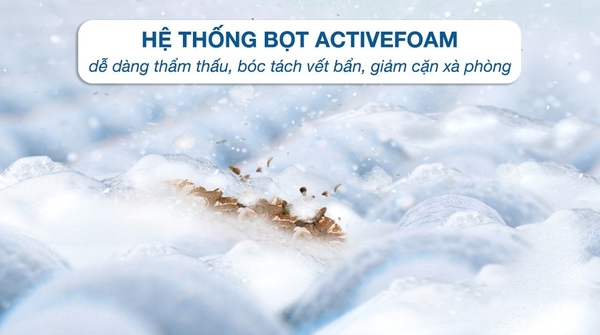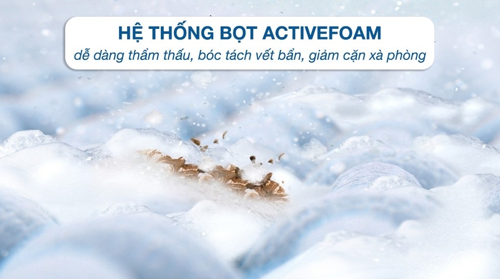 - Công nghệ tạo bọt siêu mịn ActiveFoam giúp hòa tan bột giặt hoàn toàn trước khi đưa vào lồng giặt, tạo bọt khí li ti len lỏi vào từng sợi vải, nâng cao khả năng làm sạch mà vẫn dịu nhẹ với chất liệu.
