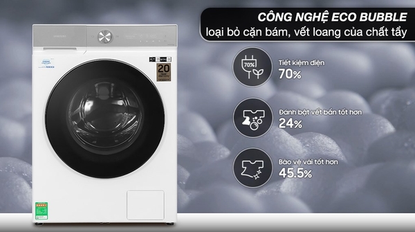 - Tạo ra bong bóng siêu mịn, thẩm thấu nhanh vào quần áo nhờ công nghệ Eco Bubble giúp đánh bay nhanh chóng các vết bẩn trên quần áo, loại bỏ hiệu quả cặn bám, vết loang của chất tẩy, bảo vệ hiệu quả màu sắc, chất liệu quần áo và tiết kiệm điện năng lên đến 70%.![]()