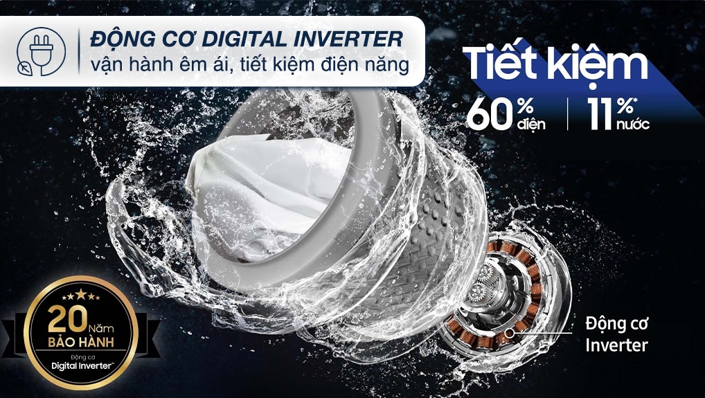 - Công nghệ Digital Inverter: Giảm thiểu hiện tượng ma sát động cơ đáng kể nhờ sử dụng nam châm vĩnh cửu, giúp lồng giặt hoạt động hiệu quả để làm sạch quần áo tối ưu mà vẫn mang lại khả năng tiết kiệm điện lên đến 60%.