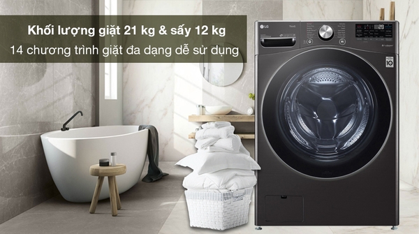 - Chiếc máy giặt sấy LG Inverter này có khả năng giặt khối lượng quần áo 21 kg hoặc sấy 12 kg, phù hợp cho những gia đình đông thành viên trên 7 người sử dụng.