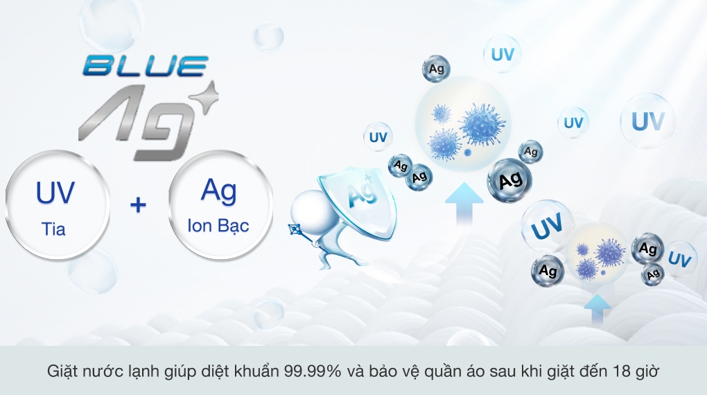 - UV Blue Ag+ là công nghệ giặt nước lạnh, sử dụng tia UV và ion bạc Ag+ để loại bỏ 99.99% vi khuẩn, bảo vệ chất liệu quần áo đặc biệt như vải màu, mỏng, len,...