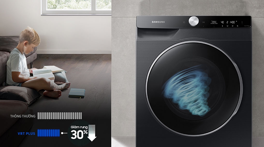 Công nghệ VRT Plus được tạo nên bởi việc cản tiến, gia cố bộ khung của chiếc máy giặt Samsung và cảm biến chống rung giúp lồng giặt được giữ cân bằng khi có tốc độ quay cao và khối lượng giặt lớn trong suốt chu trình giặt.