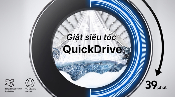 Nhờ sự kết hợp công nghệ EcoBubble làm cho bột giặt nhanh chóng thấm sâu vào quần áo kết hợp với vòi xịt siêu tốc và lồng giặt xoay nhanh giúp cho quy trình giặt sẽ hoàn thành chỉ trong 39 phút.