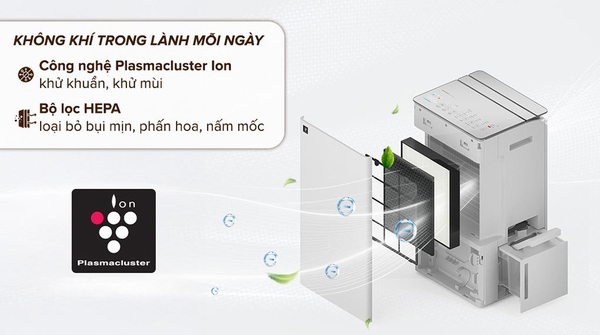 Máy được trang bị công nghệ Plasmacluster ion thế hệ mới, giúp khử khuẩn, giảm bụi mịn PM2.5 và loại bỏ mùi hôi hiệu quả.