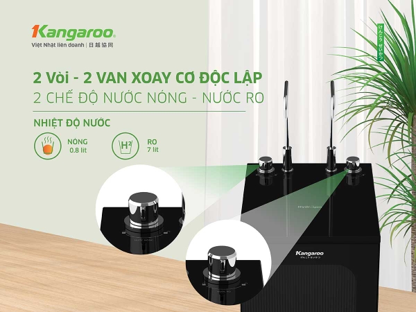 Máy lọc nước Kangaroo KG10A11 sử dụng 2 vòi – 2 van xoay tương ứng 2 chế độ nóng – Hydrogen tiện ích. Dung tích bình nóng 0.8 lít với nhiệt độ nước ≥85℃ sẽ đáp ứng đa dạng nhu cầu như ăn uống, nấu nướng, pha chế,…![]()