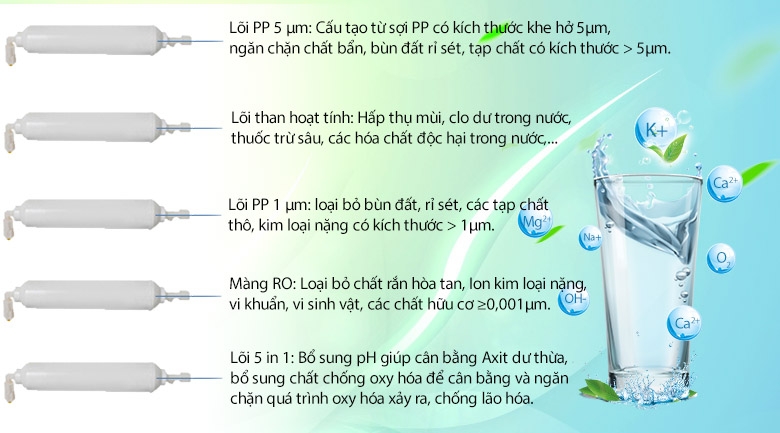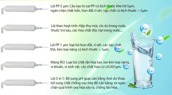 Hệ thống 5 lõi lọc giúp loại bỏ tối đa bụi bẩn, kim loại, vi khuẩn đồng thời bổ sung khoáng chất cho cơ thể