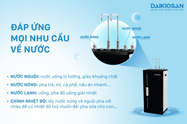 Máy lọc nước RO nóng nguội lạnh Daikiosan DSW-32709H3 đáp ứng nhu cầu sử dụng khi tích hợp 3 nguồn nước nóng - nguội - lạnh với 2 vòi tiện dụng, cung cấp nguồn nước sạch đạt chuẩn cho cả gia đình. ![]()