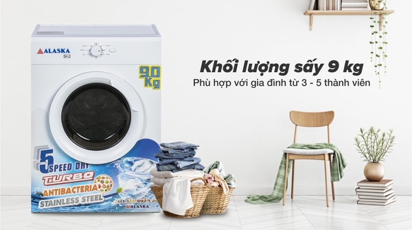 Với khối lượng sấy tối đa lên đến 9 kg, máy sấy thông hơi Alaska đáp ứng tốt nhu cầu sử dụng của gia đình từ 3 – 5 thành viên, đảm bảo quần áo luôn khô ráo đặc biệt là những ngày mưa gió kéo dài. ![]()